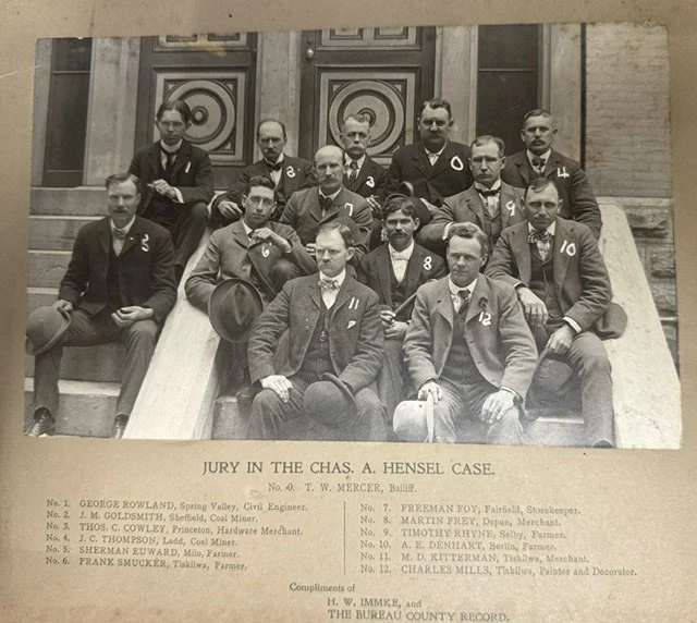 The quiet, rural town was shaken to its core in the autumn of 1901 when the gruesome murder of Eva Hensel came to light. The young woman's charred remains were discovered in the smoldering ashes of a granary fire, and suspicion soon fell upon her husband, Charles Hensel, a respected local. The evidence against him was circumstantial but damning – as the autopsy revealed Eva may have been killed before the fire took place. Charles maintained his innocence, claiming the fire was an accident and that he had rushed to get help, but the townspeople were not convinced. Making matters even more haunting was the work of a mysterious local medium who communicated with the spirit of Eva. What secrets did Eva impart through the thin veil separating life from death? Theories swirled that Charles had brutally strangled his wife during a heated argument, then attempted to cover up his heinous crime by setting the barn ablaze to destroy the evidence. The trial that followed captivated the entire region, as the prosecution methodically built their case against the accused murderer, presenting damning forensic evidence and testimony from witnesses who described Charles' suspicious behavior in the hours after the tragedy. Included in the group of 12 jurors were a few Tiskilwa natives: Frank Smucker, M.D. Kitterman, and Charles Mills. Was Charles guilty of murder? Read on for the chilling account from the local newspaper…