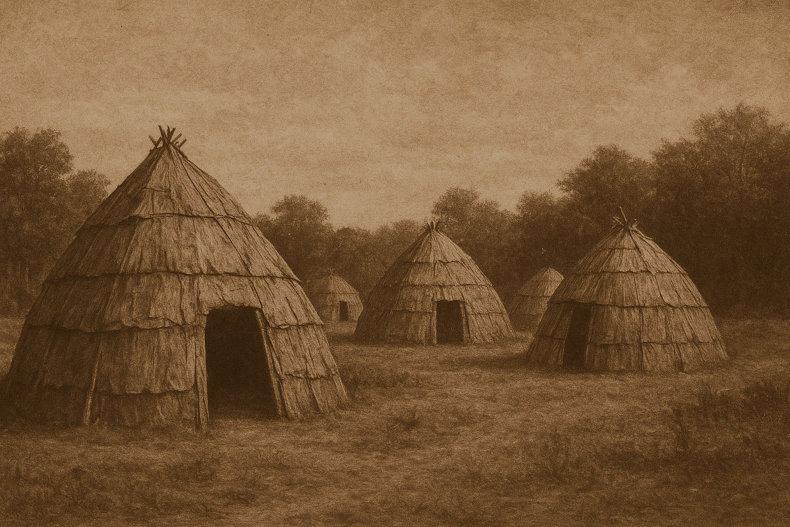 The lodges, Matson wrote, were built of bark or reeds, set close together without regular streets or alleys. Each had an opening in the south side and a hole at the top to let out smoke from the central fire. The settlement stretched along both sides of a spring-fed branch of the river. Around the village lay their cornfields, small fenced patches scattered through the bottom prairies. The fences were made of sticks, with poles tied on by bark or vines to keep out ponies.